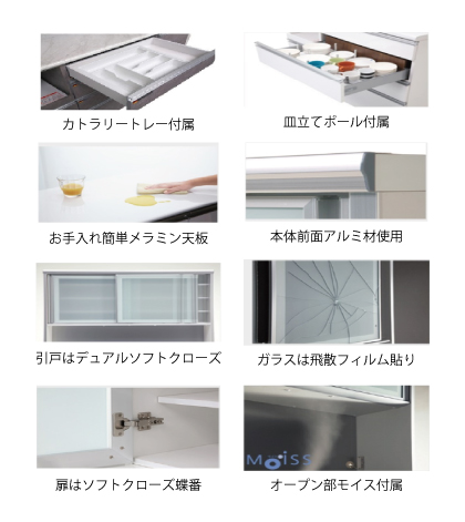 扉付きだから生活感を隠し、キッチンはいつでもすっきりとした印象に。機能性とデザイン性を兼ね備えたレンジボードを、この機会にぜひご検討ください。